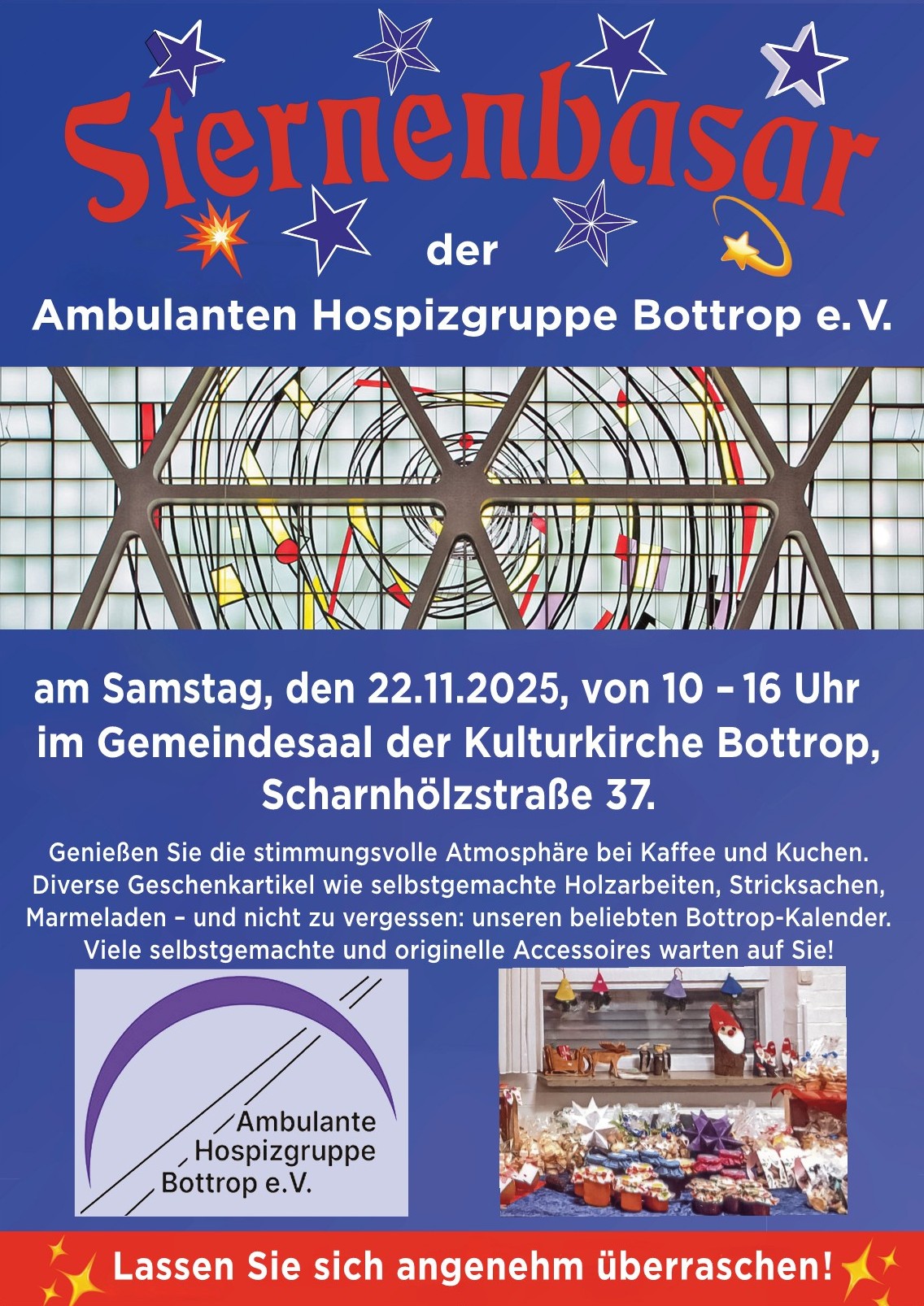 Am 22. November findet der traditionelle Sternenbasar der Ambulanten Hospizgruppe Bottrop von 10.00 bis 16.00 Uhr im Gemeindesaal neben der Kulturkirche (Hl. Kreuz), Scharnhölzstr. 37, Bottrop, statt.